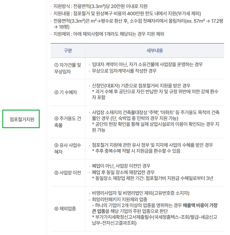 철거비는 임대차 계약 사업장만 지원(자가·무상임차 제외)