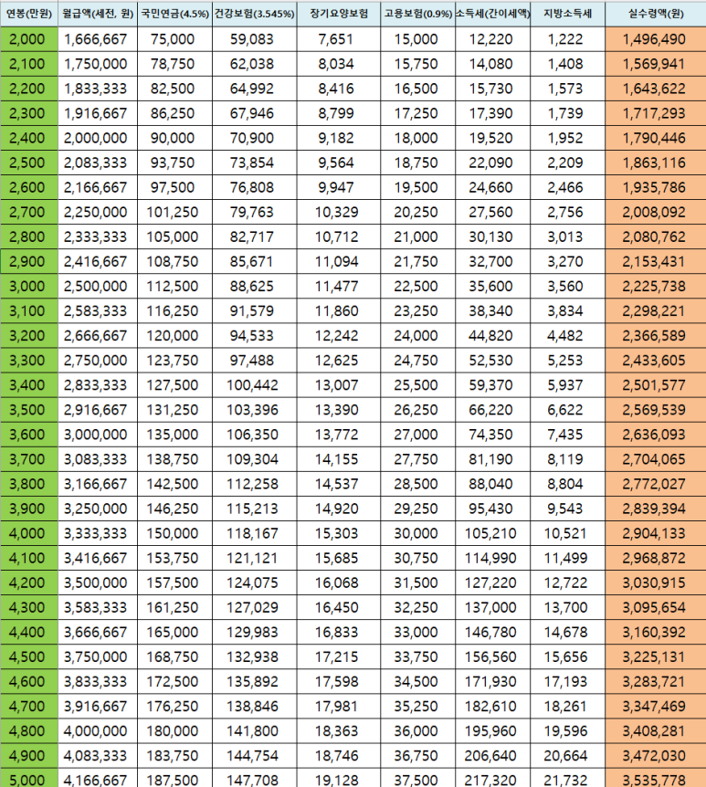 - 연봉 5,000만 원 → 월 실수령액 약 350만 원