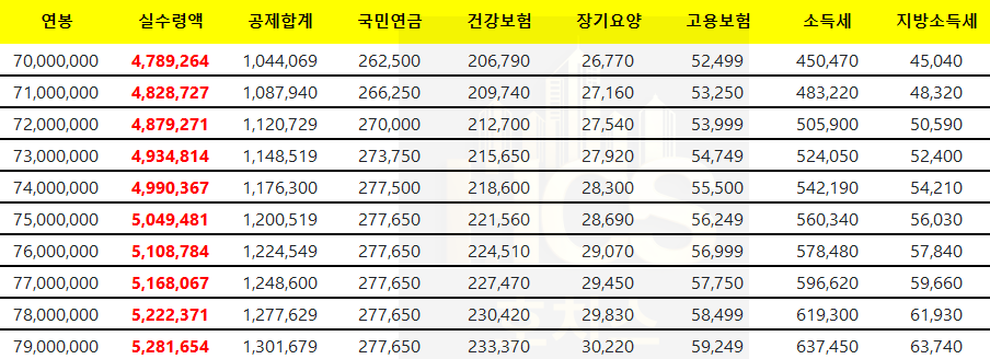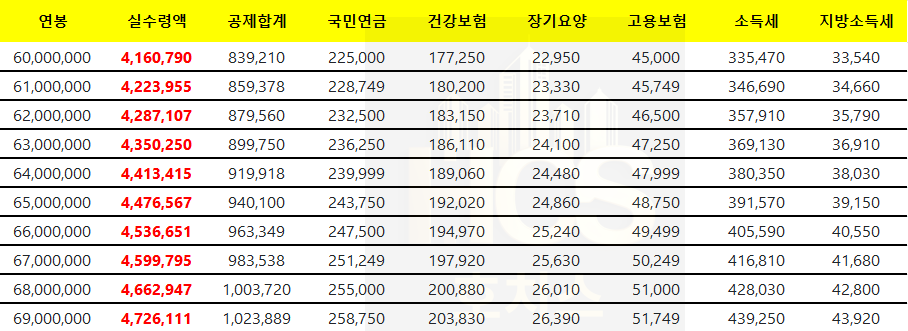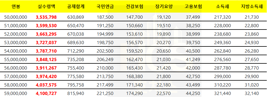 이제 연봉별 실수령액을 살펴보겠습니다.