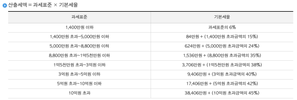과세표준을 살펴보면 누진세율이 적용되어 소득이 많아질수록 세율이 급격히 증가하는 구조입니다.