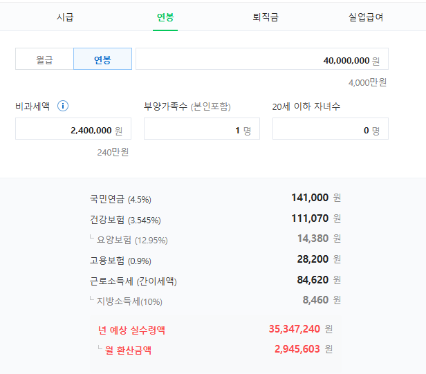 네이버에서 제공하는 "연봉 실수령액 계산기"를 검색하면 간단히 부양가족 수와 연봉을 입력해 계산할 수 있습니다.