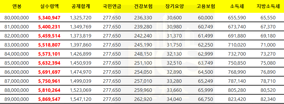 이제 연봉별 실수령액을 살펴보겠습니다.