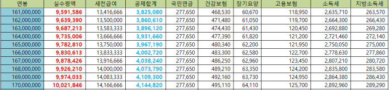 연봉 1억6천~1억7천만원 세후월급표(실수령액)