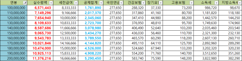 연봉에 따라 실수령액을 빨간색숫자로 제일 먼저 끌어왔고