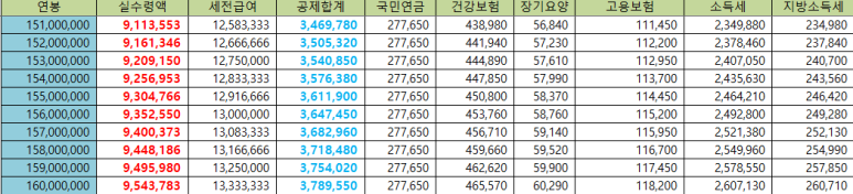 연봉 1억5천~1억6천만원 세후월급표(실수령액)