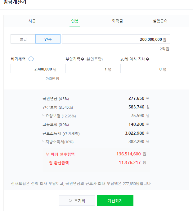 연봉 2억원 실수령액 : 11,376,216원