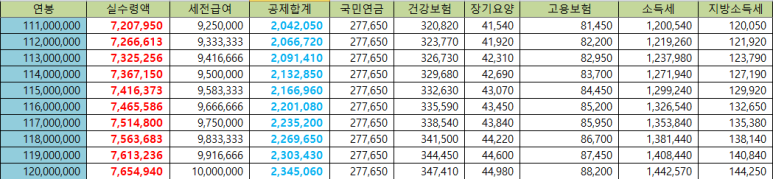 [1억 1천만원 ~1억 2천만원 연봉 실수령액]