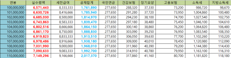 [1억원 ~1억 1천만원 연봉 실수령액]