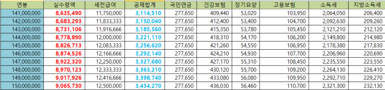 연봉 1억4천~1억5천만원 세후월급표(실수령액)