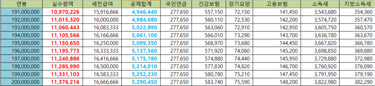 [1억 9천만원 ~2억원 연봉 실수령액]