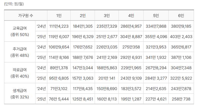 아래는 2025년 일부 가구 규모별 중위소득 구간을 발췌한 표입니다.