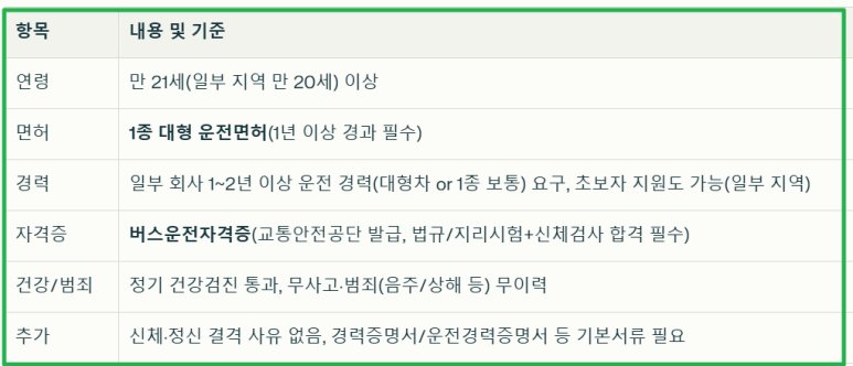 - 필수 면허: 1종 대형면허(취득 후 1년 이상 경과 필요)