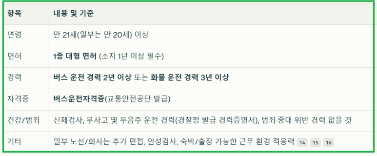 - 운전 경력: 버스 2년 이상 또는 화물차 3년 이상 필수