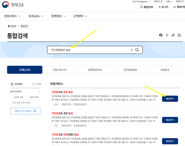 - 정부24(www.gov.kr) 접속 후 ‘주민등록표 등·초본 발급’ 메뉴 선택