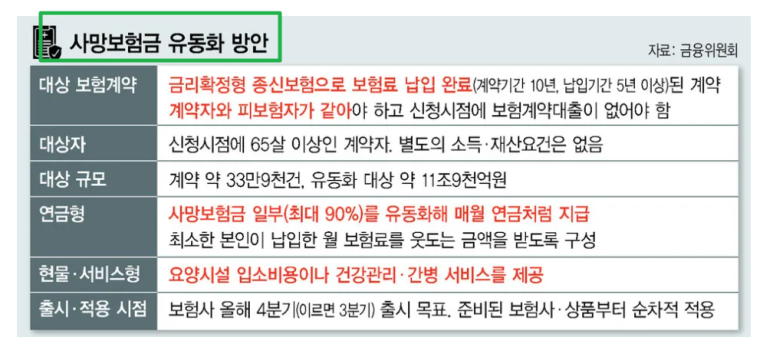 금융위원회는 2025년 3분기부터 종신보험 상품에 대해 사망보험금 일부를 생존 중 연금 형태로 수령할 수 있도록 제도를 도입합니다.