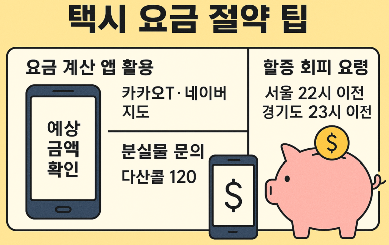 출발 전 앱으로 예상 요금 체크, 심야 최고 할증 시간대 회피 등 기본 절약만 해도 택시비 부담을 크게 줄일 수 있습니다.