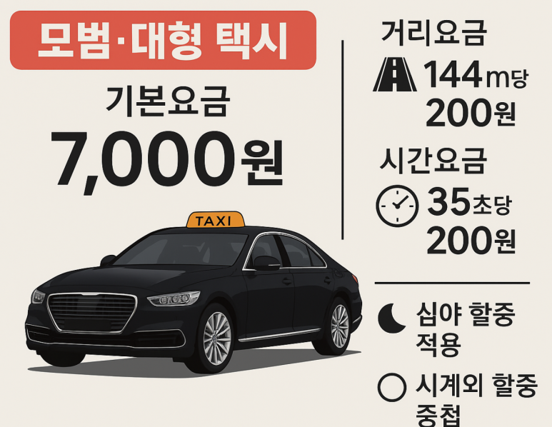 모범·대형택시: 기본 7,000원(3km), 거리요금 144m당 200원, 시간요금 35초당 200원, 심야·시계 외 할증 중첩 적용.