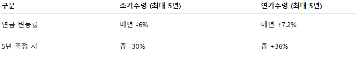 연금수령 시기 조정 가능: 조기수령 시엔 매년 6% 감액, 연기 수령 시엔 7.2% 증액