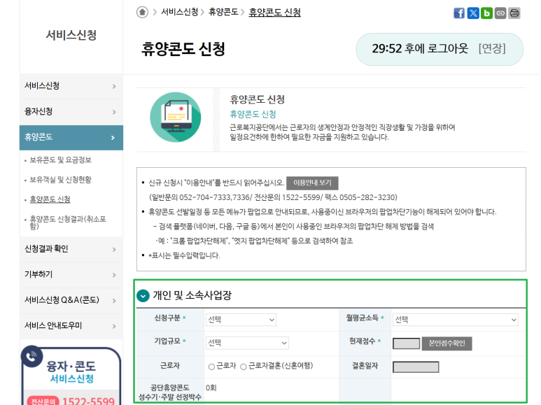 ‘근로자 휴양콘도’ 메뉴 내 신청 페이지에서 진행합니다.