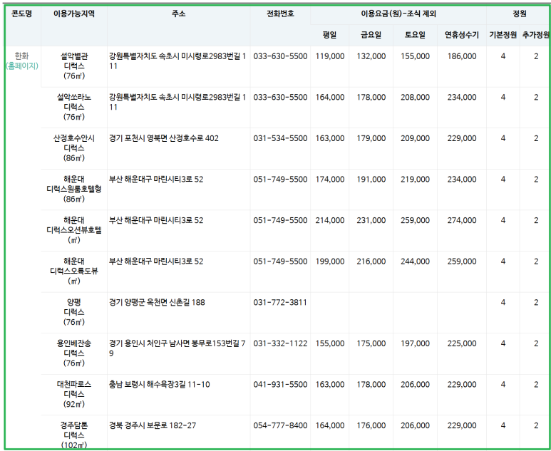 콘도별 시기와 객실 타입에 따라 6만 원대부터 20~30만 원대까지 요금이 다양하게 책정되어 있으며,