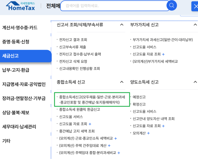 - ‘세금 신고 → 종합소득세’ 선택 후 일반 신고 진행