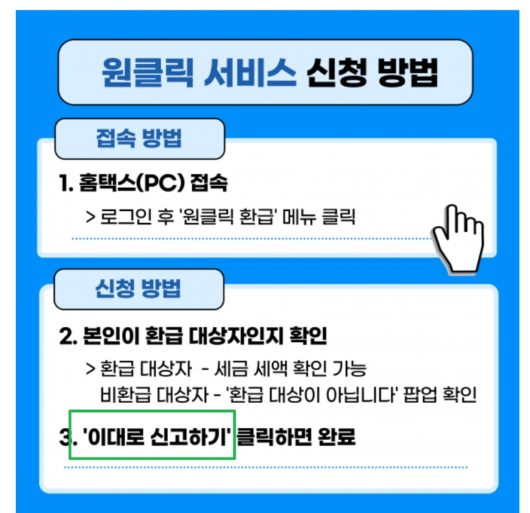 참고로 금번에 신설된 "원클릭 서비스"로, 본인이 환급 대상자인지 확인하신다음에 "이대로 신고하기" 클릭하면 신고를 간편하게 하실수도 있으니 참고바랍니다.
