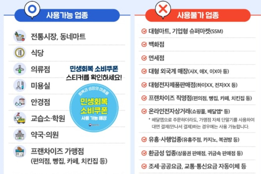 - 연 매출 30억원 이하 소상공인 매장(동네 식당, 병원, 약국, 편의점, 전통시장, 미용실 등)과 지역사랑상품권 가맹점에서 사용 가능.