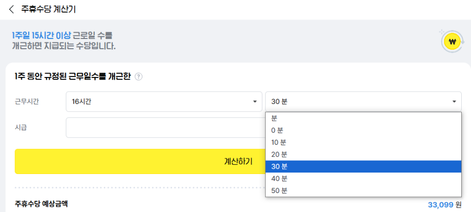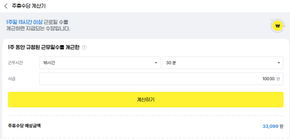 16시간 30분으로 직접 계산을 해보았더니 33,099원을 받을 수가 있습니다.
