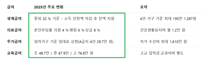• 생계급여: 4인가구 최대 195만1,287원(중위소득 32% 이하, 소득 인정액 차감한 전액)