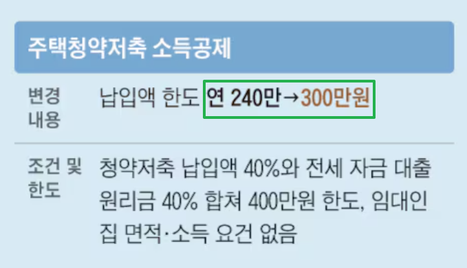 2025년부터 주택청약저축 공제 한도는 최대 300만 원으로 상향되어 무주택 세대주라면 최대 120만 원까지 세금을 돌려받을 수 있습니다.