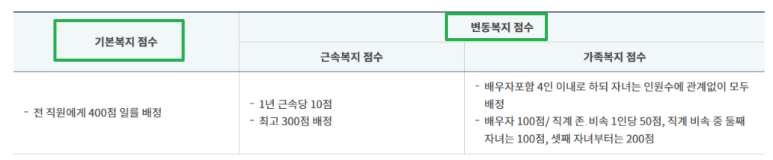기본점수(보통 400점, 1점=1,000원)가 일괄 지급되고, 근속·가족 등 변동점수(근속 10점/1년, 배우자 100점, 자녀 50~200점/명 등)가 추가되어 산정됩니다.
