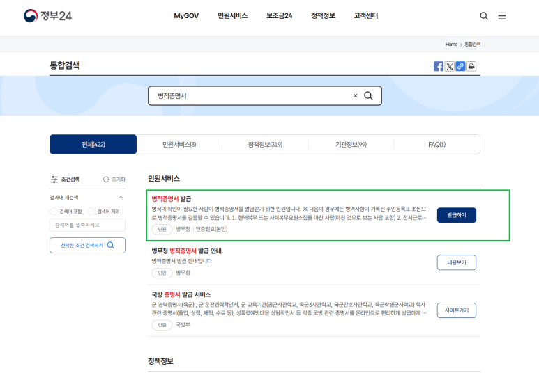 • 정부24 홈페이지(앱) 접속 → '병적증명서' 검색 및 선택