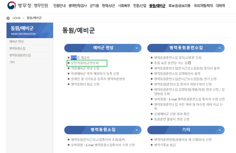 • 민원신청 → 동원/예비군 → '군전역일자/군번조회' 메뉴 선택