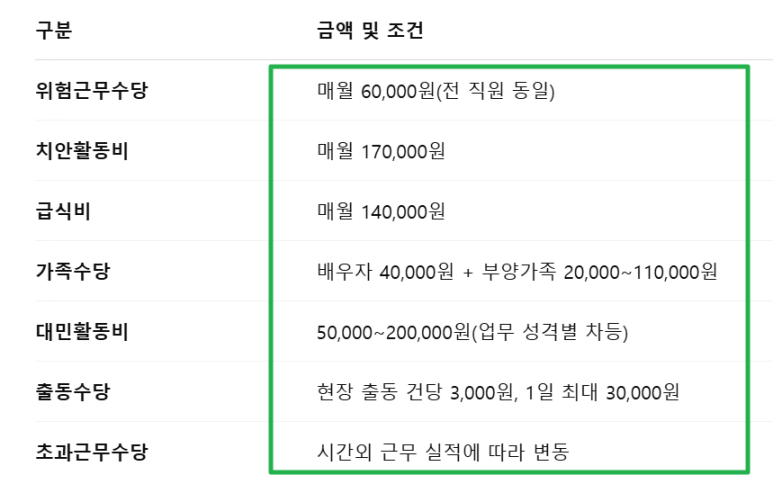 야간근무, 휴일근무가 잦은 부서일수록 초과근무수당, 대민활동비, 출동수당 등 조건부 수당이 더해져 급여 차이가 벌어집니다.