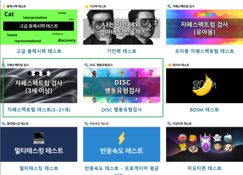 - 인기 테스트: 자폐 스펙트럼, 행동유형, 심층 성격·기질 분석 등