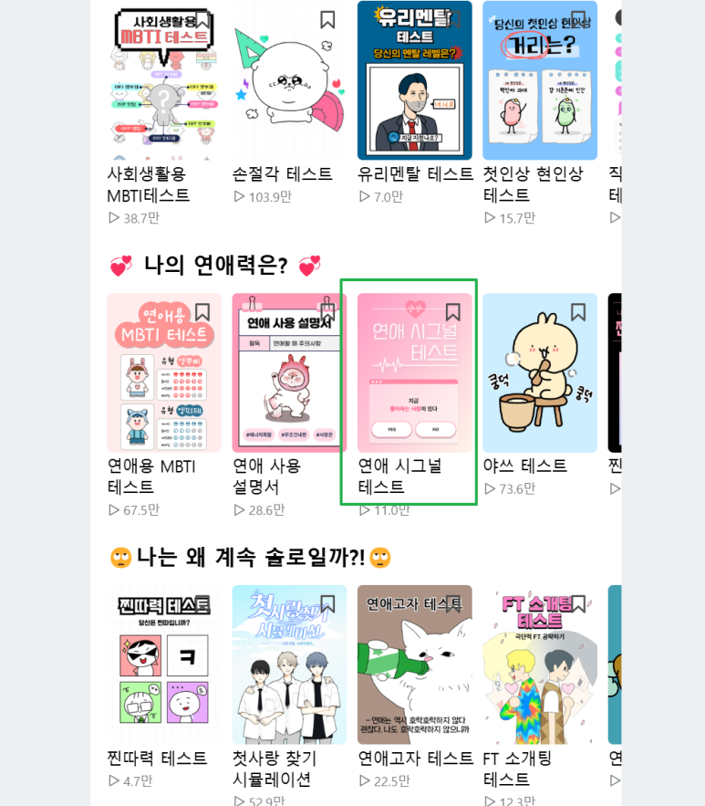 - 주요 테스트: 썸BTI, 연애 유형, 자존감 체크