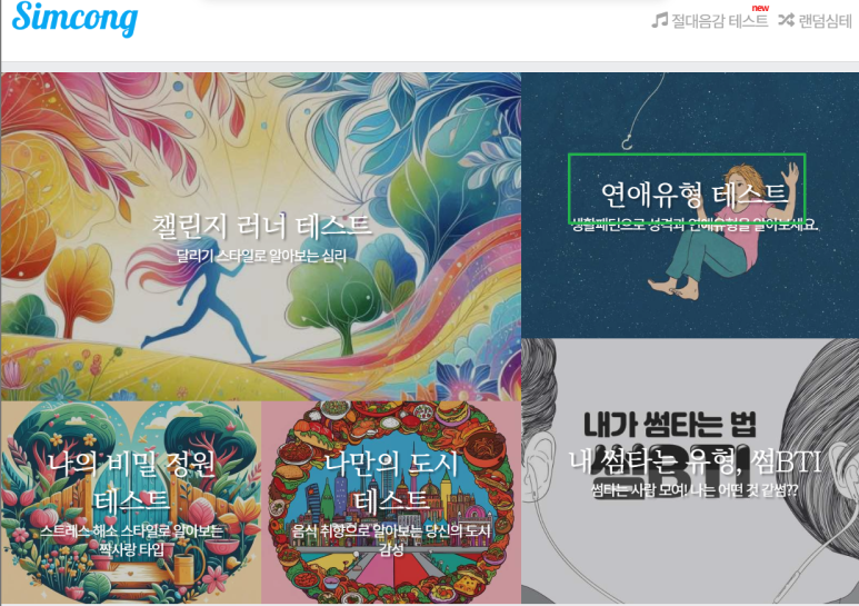 - 심콩: 연애 성향, 자존감, 썸 BTI 등 연애와 감정 심리를 다루는 트렌디한 테스트가 인기입니다. 회원가입 없이 연애상대 유형, 궁합, 자아탐색 등 다양한 심리분석이 가능하며, 테스트 결과 공유가 쉬워 SNS에서도 활발하게 활용되고 있습니다.