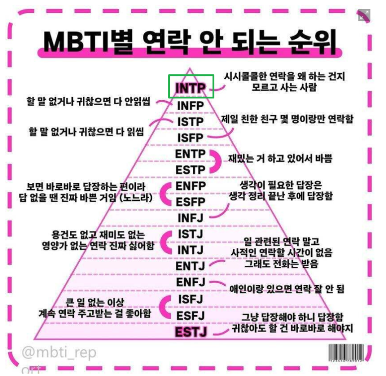 - INTP는 논리·분석 중심의 연애로, 깊은 신뢰를 구축하나 감정적 표현은 부족해 답답하다는 평가를 들을 수 있습니다.