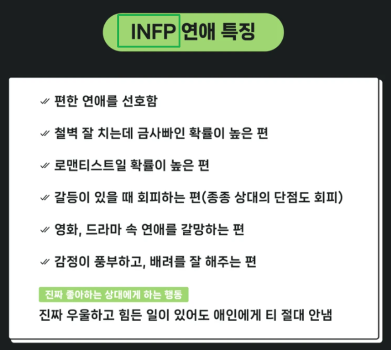 - NFP 남자: 가치관과 신념을 존중하고 세심하게 공감해 주기, 부담스럽지 않은 천천히 다가감, 혼자만의 시간 존중
