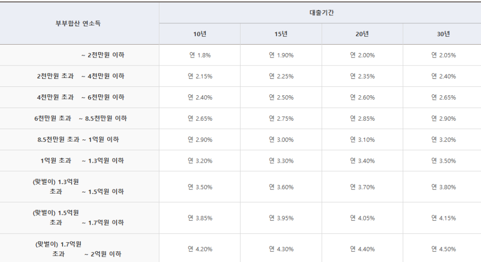 소득별로 1.6~3.3%(10~30년 만기)에 책정되며, 특례금리는 기본 5년간 적용.