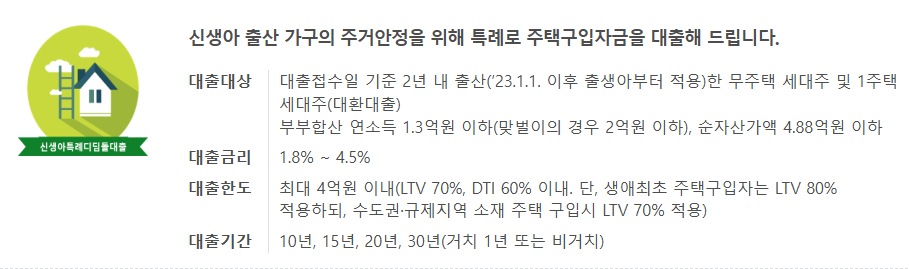 신생아 특례대출은 최근 2년 내 출산(또는 입양)한 무주택 가정 등이 저금리로 주택구입자금을 대출받을 수 있는 정책금융입니다.
