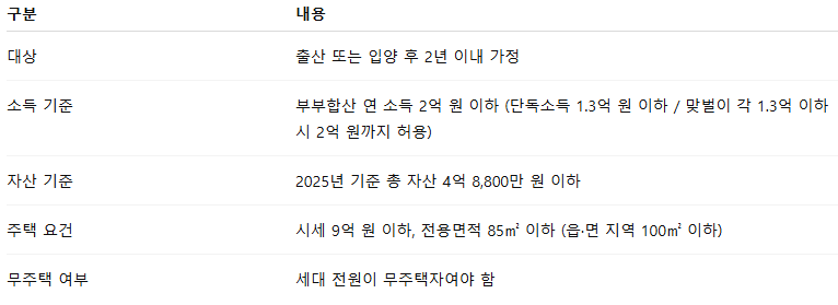 2025년부터는 첫째 자녀 가정까지 확대, DSR(총부채원리금상환비율) 적용 제외, 일반 주담대보다 유리한 조건이 특징입니다.