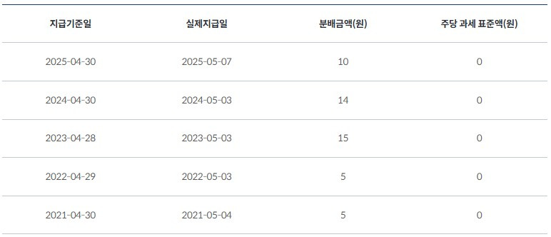 - 최근 지급내역: 2025년 10원, 2024년 14원, 2023년 15원, 2022·2021년 5원