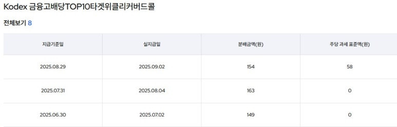 • 최근 분배금: 8월 154원, 7월 163원, 6월 149원, 5월 137원, 4월 122원 등