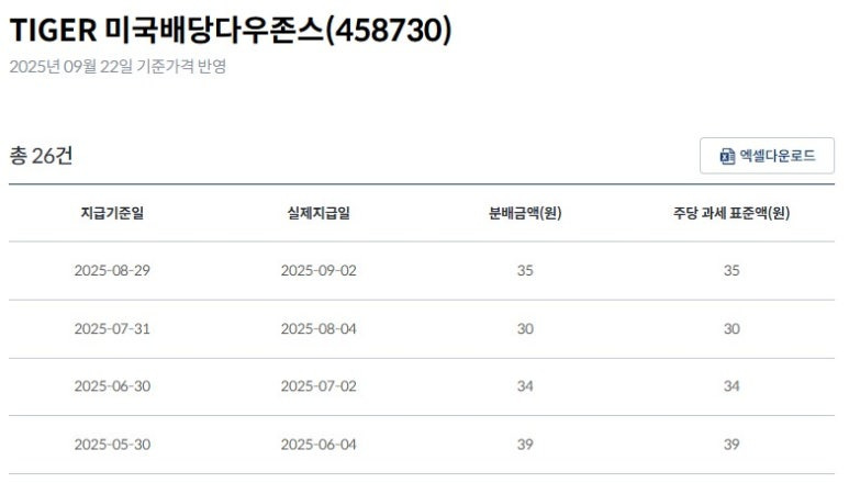 - TIGER 미국배당다우존스 ETF 최근 배당: 8월 35원, 7월 30원, 6월 34원 등(월별 지급)