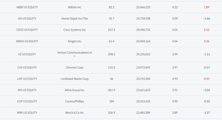 - 대표 종목: AbbVie(바이오·면역치료제), Home Depot(미국 주택 자재·DIY), Cisco(네트워크·클라우드·보안), Amgen(바이오 신약), Verizon(통신·5G), Chevron(에너지 대장주), Lockheed Martin(방산주), Altria(담배·전자니코틴), ConocoPhillips(셰일·에너지), Merck(백신·항암제)