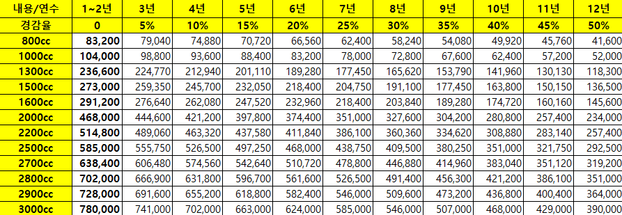 차량 연식이 오래될수록 ‘차령경감제도’가 적용되어 매년 5%씩 최대 50%까지 세금 감면을 받을 수 있어, 오래된 차량일수록 세 부담이 줄어듭니다. 또한 전기차는 배기량이 없으므로 비영업용 기준으로 정액 10만 원만 부과됩니다.