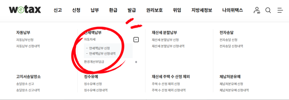 - [위택스] 홈페이지에 접속해 자동차세 → 연세액납부 신청을 클릭, 차량번호 입력 후 할인 금액을 바로 확인 가능