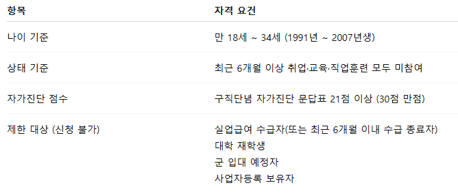 단, 실업급여 수급 중이거나 최근 6개월 내 실업급여 종료자, 대학 재학생, 군 입대 예정자·복무자, 사업자등록자 등은 참여 제한이 있으니 자격 확인이 필요합니다.