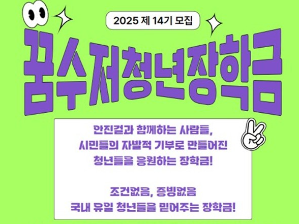 2025년 14기 꿈수저청년장학금은 9월 9일~10월 4일 온라인 신청이 가능합니다. 합격자는 10월 중순 발표, 장학금은 10월부터 2026년 3월까지 매달 50만 원씩 6회 지급됩니다.